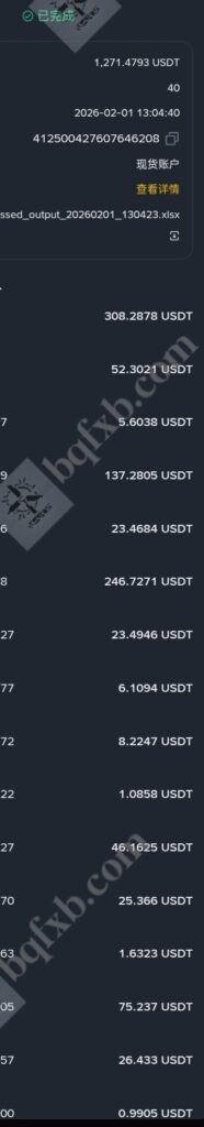 币安返佣-2026.2.1每天返佣更新,今日返佣1271.47u!作者: bqfxb / 2026年2月1日 6.18之后每天返佣记录以单独文章更新在返佣展示,6.18之前的返佣记录在文章返佣信息查询网站 返佣记录展示